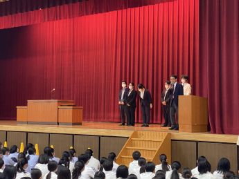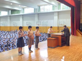 表彰では中等部柔道部(男子)、中等部剣道部(男女)、高等学校剣道部(女子)の全国大会の結果が表彰されました。