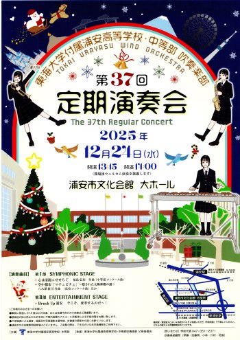 本校吹奏楽部では、12月24日(水)14時から浦安市文化会館で第37回定期演奏会を開催します。中等部、高校共に夏のコンクールで取り組んだ楽曲をはじめ、聞いて、見て楽しめるポップスの楽曲も用意し、クリスマスイブの午後のひと時を楽しんでいただけるよう部員・顧問一丸となって準備に励んでおります。
